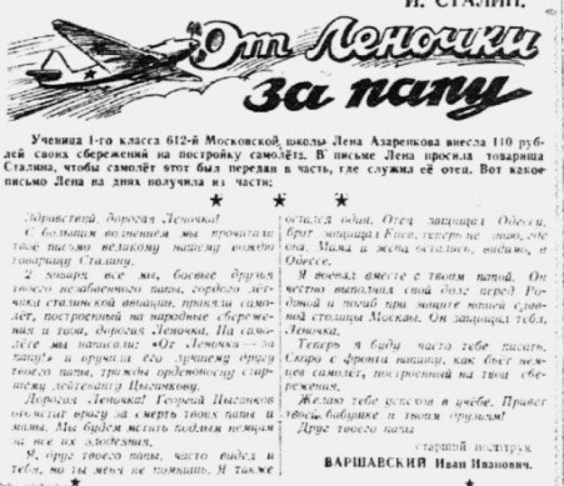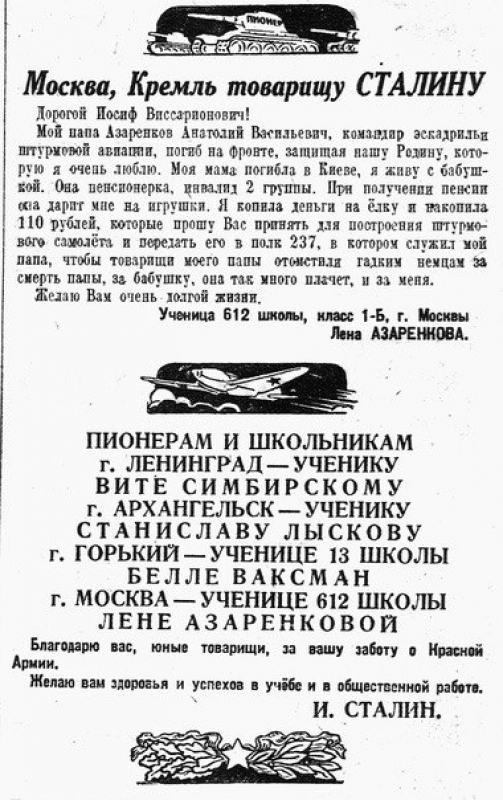 «Дорогой Иосиф Виссарионович! Мой папа, Азаренков Анатолий Васильевич, командир эскадрильи штурмовой авиации, погиб на фронте, защищая нашу Родину, которую я очень люблю. Моя мама погибла в Киеве, я живу с бабушкой. Она пенсионерка, инвалид 2-й группы. При получении пенсии она дарит мне игрушки. Я копила деньги на ёлку и накопила 110 рублей, которые прошу вас принять для построения штурмового самолёта, и передать его в полк 237, в котором служил мой папа, чтобы товарищи моего папы отомстили гадким немцам за смерть папы, за бабушку, она так много плачет, и за меня. Желаю Вам очень долгой жизни. Ученица 612 школы, класс 1-Б, г. Москвы Лена Азаренкова».