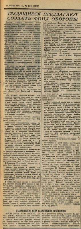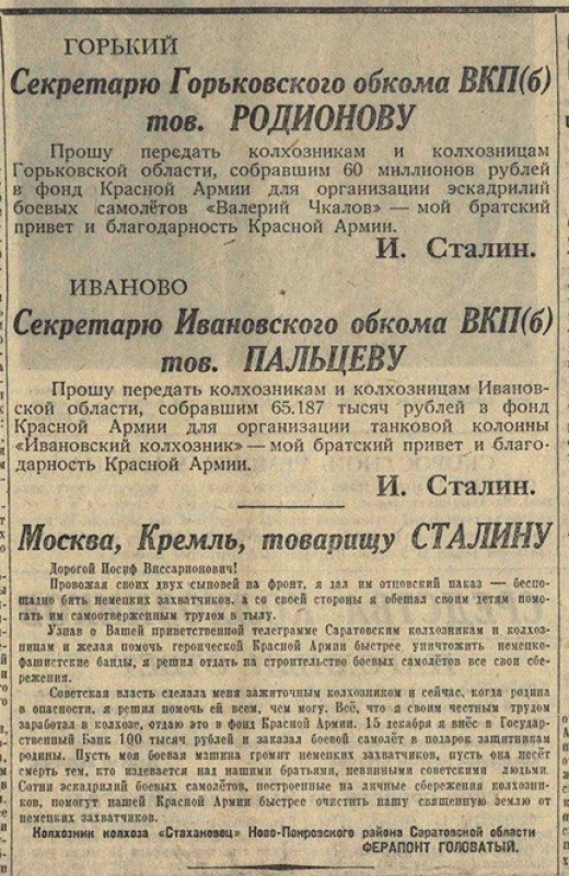 «Я решил отдать на строительство самолёта все свои сбережения. Советская власть сделала меня — бывшего батрака — зажиточным колхозником. Сейчас, в грозные дни войны, каждый из нас, не жалея средств и жизни, должен оказать помощь своей Родине, Красной Армии».