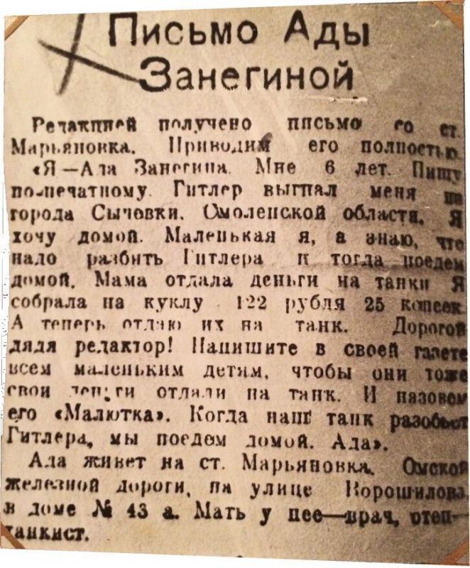 «Я Ада Занегина. Мне 6 лет. Пишу по-печатному. Гитлер выгнал меня из города Сычёвка Смоленской области. Я хочу домой. Я собрала на куклу 122 рубля 25 копеек. А теперь отдаю их на танк. Дорогой дядя редактор! Напишите всем детям, чтобы они тоже свои деньги отдали на танк. И назовем его «Малютка». Когда наш танк разобьёт Гитлера, мы поедем домой».