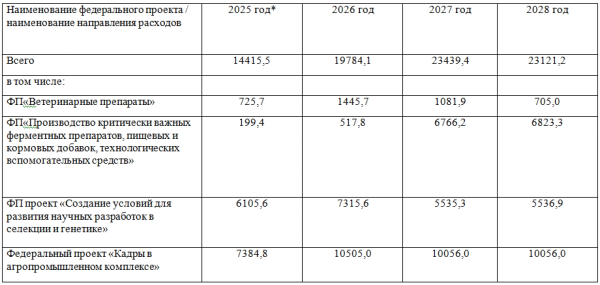 Всего на 2026 год на развитие агропромышленного и рыбохозяйственного комплексов в проекте бюджета на 2026 год предусмотрено (по четырём госпрограммам — программа развития сельского хозяйства, программ развития сельских территорий, программа вовлечения земель в сельскохозяйственный оборот, программа развития рыбохозяйственного комплекса) около 430 млрд рублей (без учета резерва), в 2027 году — 308,5 млрд рублей и в 2028 году — 338,6 млрд рублей.