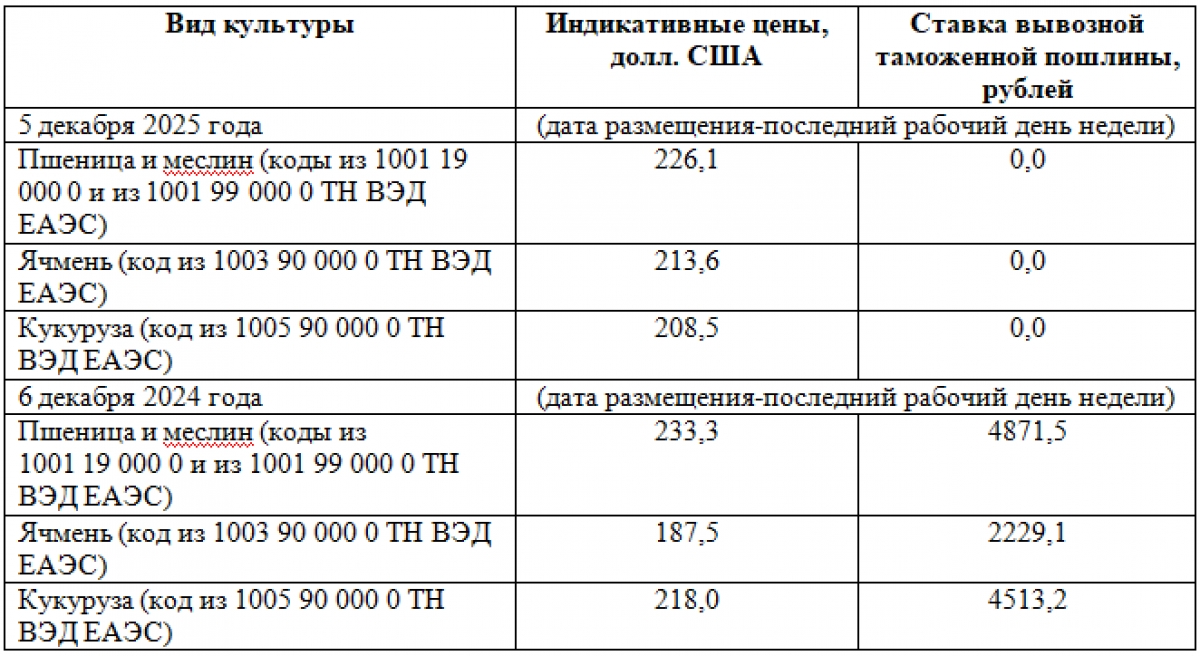 Таблица 1. Примеры индикативные цены и ставки вывозной таможенной пошлины (по данным с сайта Минсельхоза России