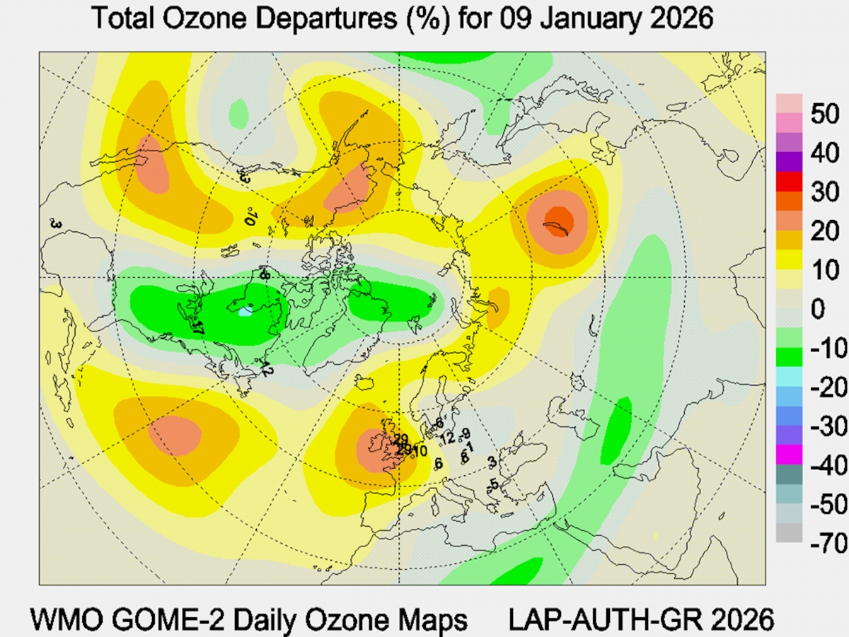 Рис. 3. Аномалии общего содержания озона в Северном полушарии 9 января 2026 года.