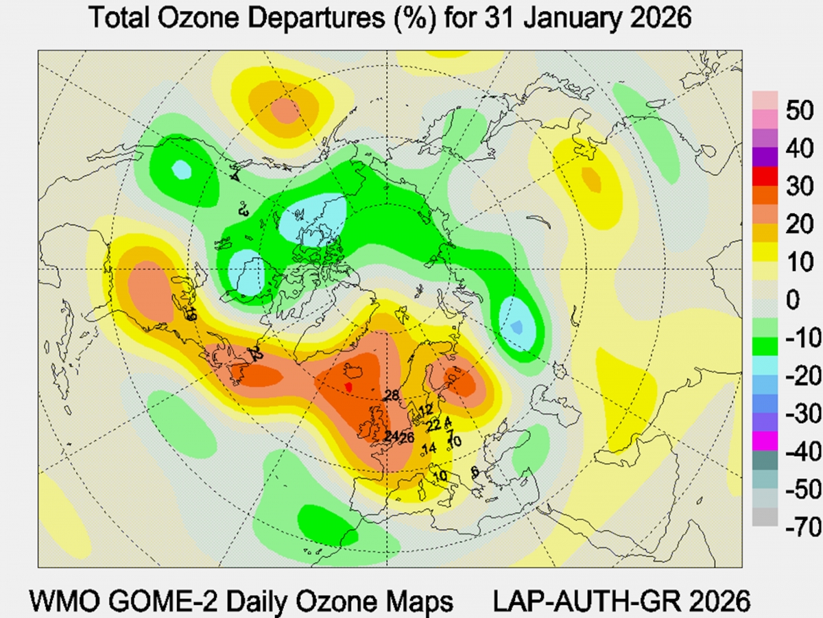 Рис. 7. Аномалии общего содержания озона в Северном полушарии 31 января 2026 года.