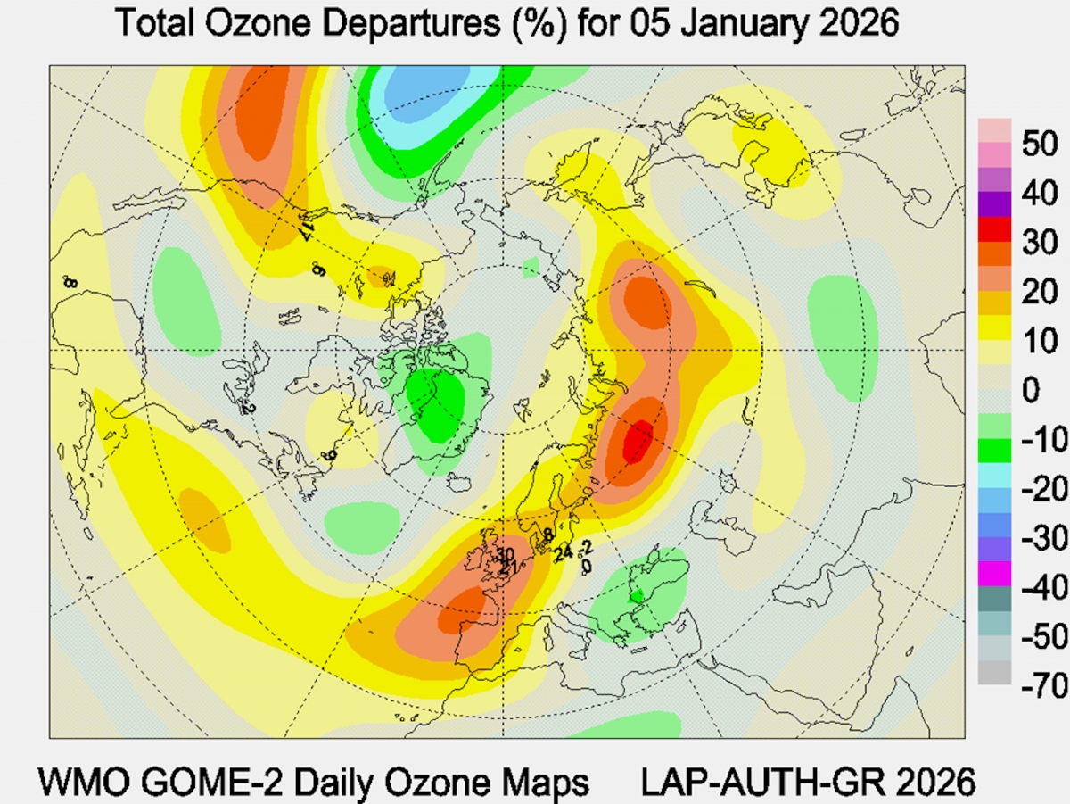 Рис. 2. Аномалии общего содержания озона в Северном полушарии 5 января 2026 года.