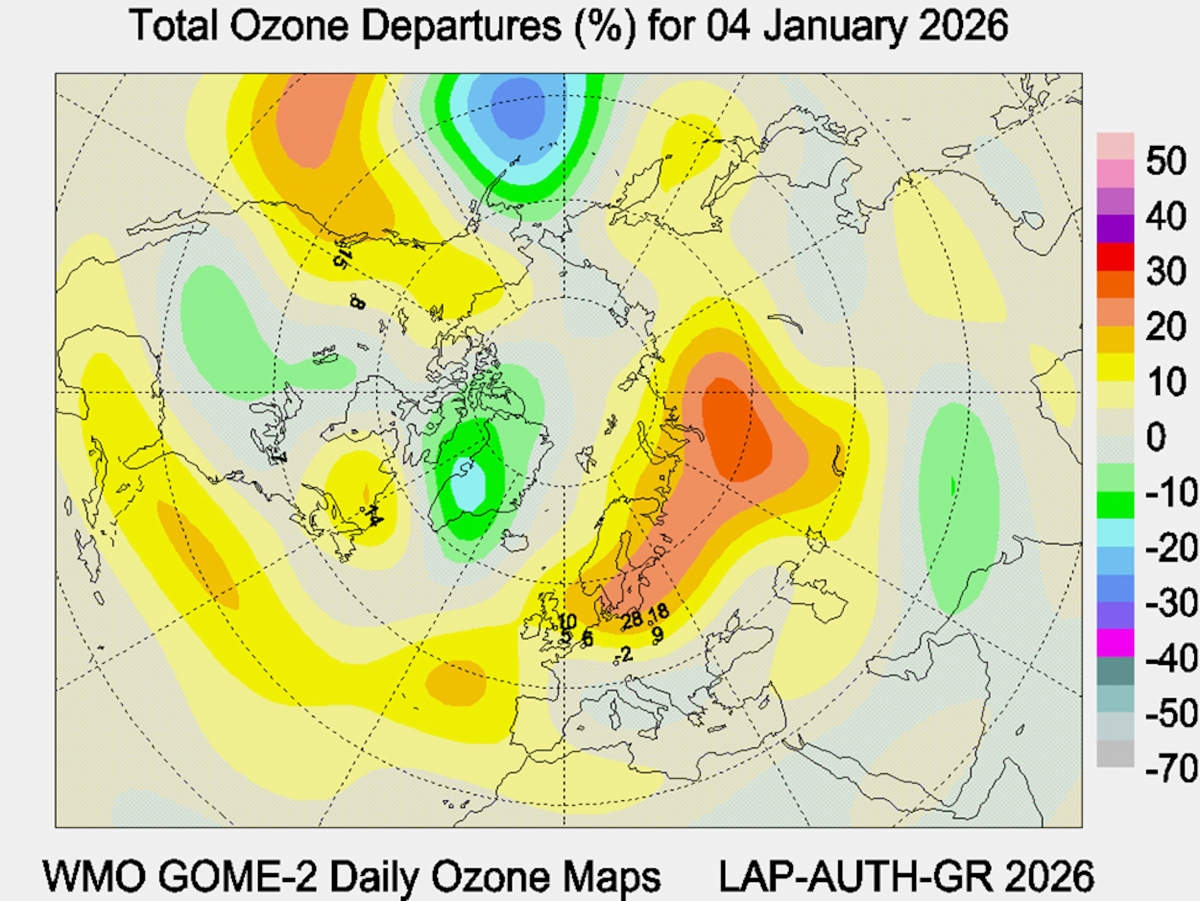 Рис. 1. Аномалии общего содержания озона в Северном полушарии 4 января 2026 года.