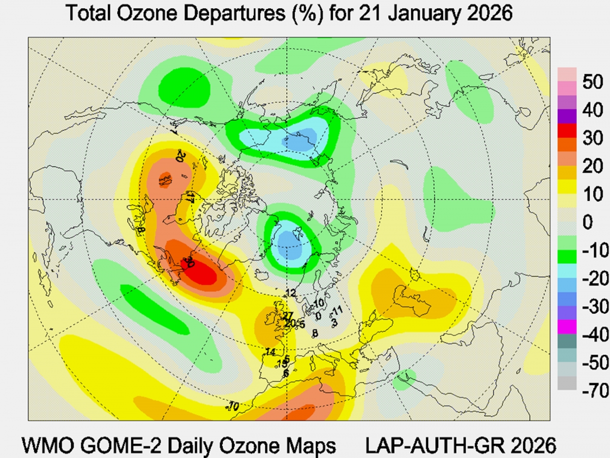 Рис. 6. Аномалии общего содержания озона в Северном полушарии 21 января 2026 года.