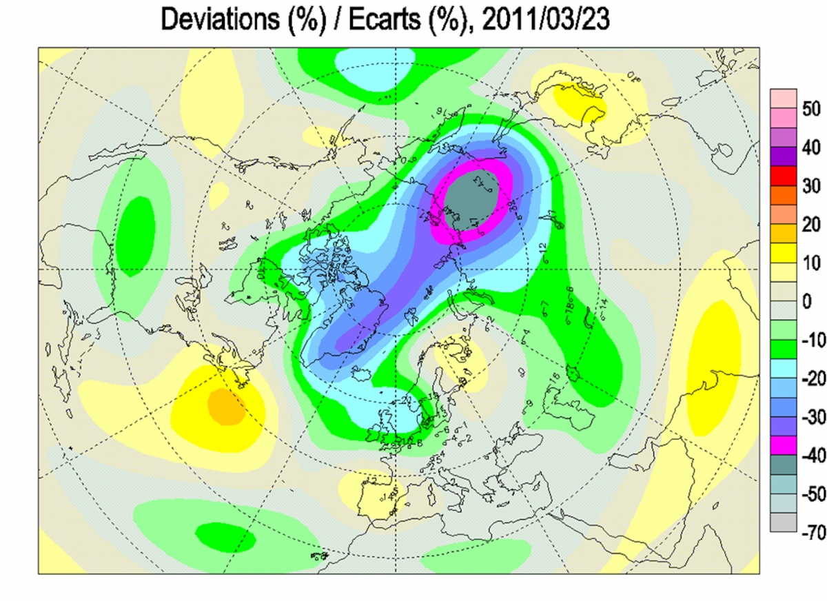 Рис. 2. Аномалии общего содержания озона в Северном полушарии 23.03.2011