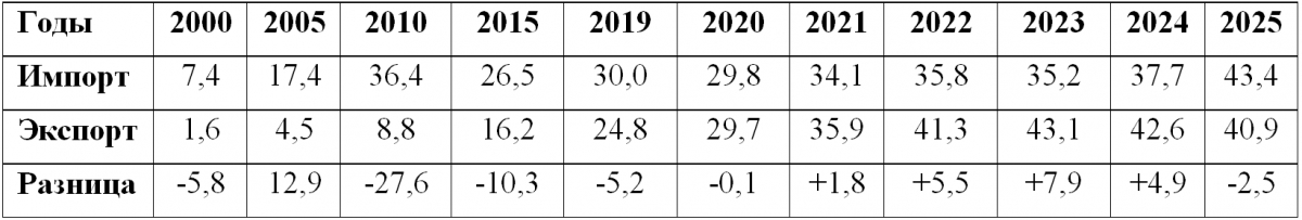 По итогам 2025 года, страна опять вернулась к превышению импорта аграрной продукции над экспортом в стоимостном выражении. Экспорт продукции АПК снизился на 4,1%, а её импорт вырос на 15% (таблица 2). Министр сельского хозяйства Оксана Лут, объясняла снижение экспорта валютным курсом, который не способствует отгрузкам на внешние рынки.