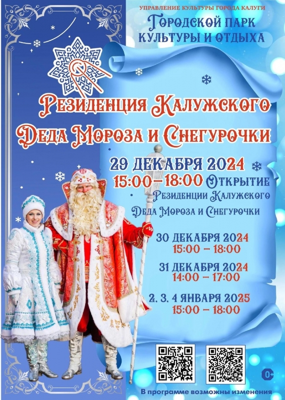 Резиденция Деда Мороза и Снегурочки будет работать 29 и 30 декабря, 2, 3 и 4 января с 15:00 до 18:00. 31 декабря резиденция откроется в 14:00 и будет работать до 17:00.