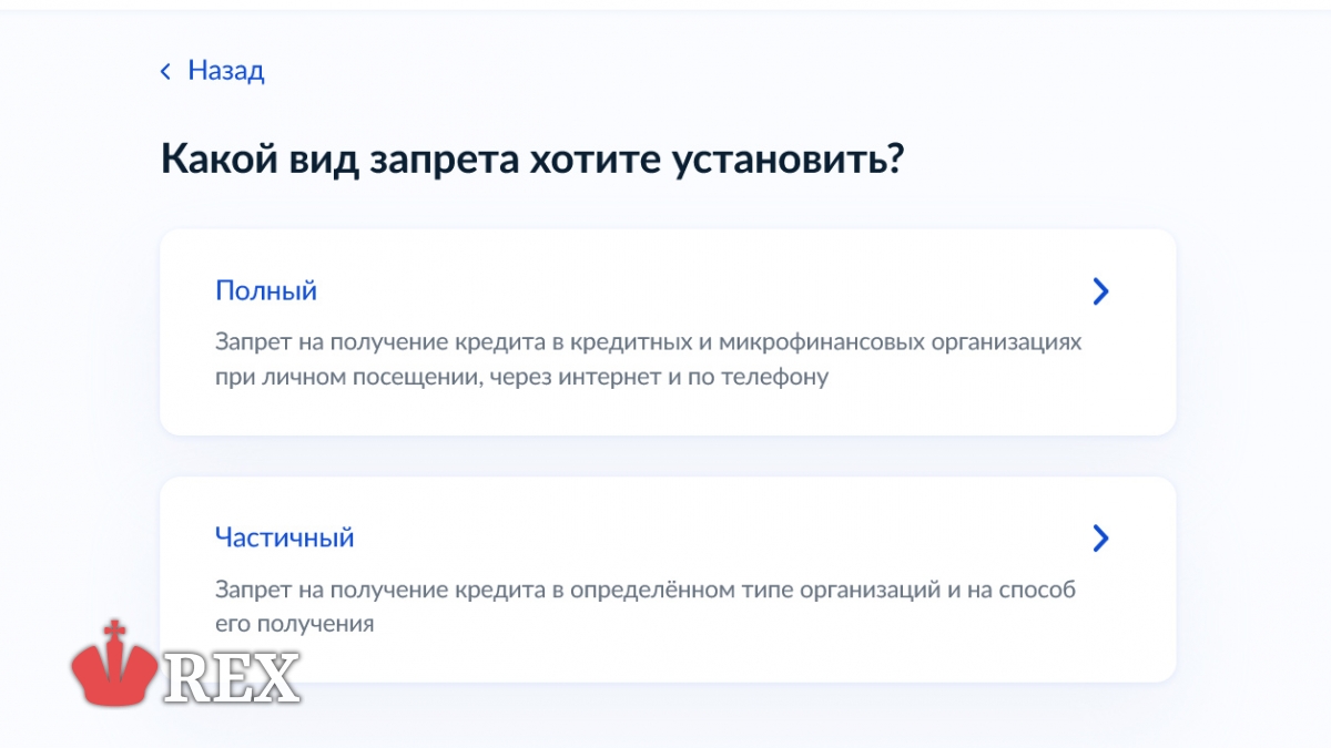 - Полный - запрет на получение кредита в кредитных и микрофинансовых организациях при личном посещении, через интернет и по телефону.
