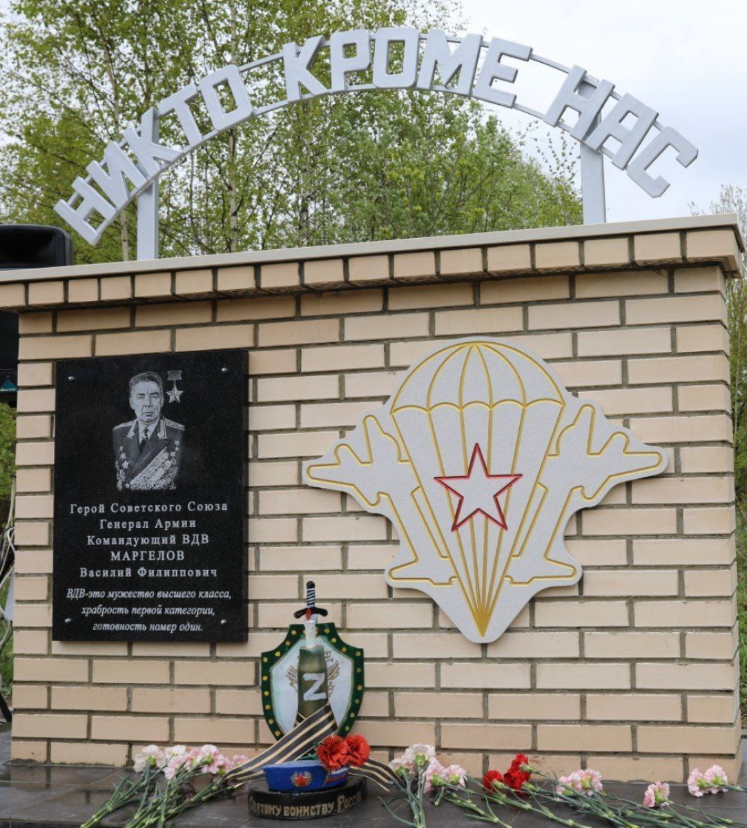 «Одним из элементов памятникам десантникам стала знаменитая фраза генерала Василия Маргелова «Никто, кроме нас!». Ещё одна часть монумента — мемориальная доска самому Герою Советского Союза Василию Маргелову», — отметил Михаил Голубев.