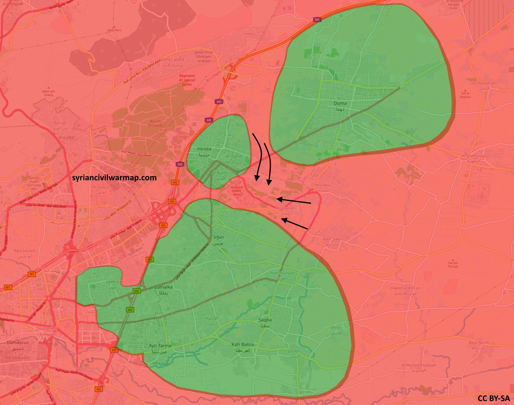 Ранее, сирийской армии удалось взять крупный населенный пункт Месраба и район сельскохозяйственных угодий Аль-Адравани в Харасте, приблизившись вплотную к трассе "Хараста - Дума".